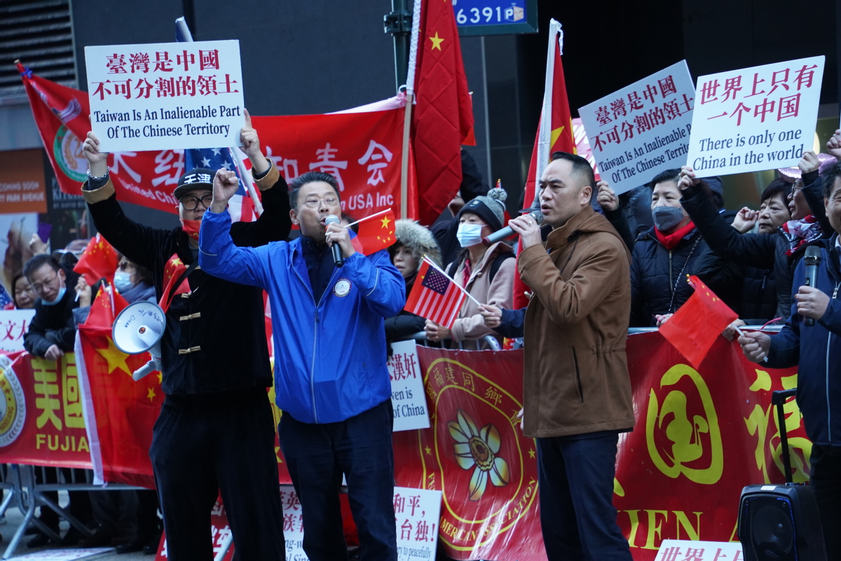 A crowd of 100 people in Midtown Manhattan on Thursday waved Chinese and American national flags and held signs saying, "There is only one China in the world", "Support China's reunification and resolutely oppose Taiwan independence" and "Taiwan independence has no way out; Taiwan independence is a dead end".