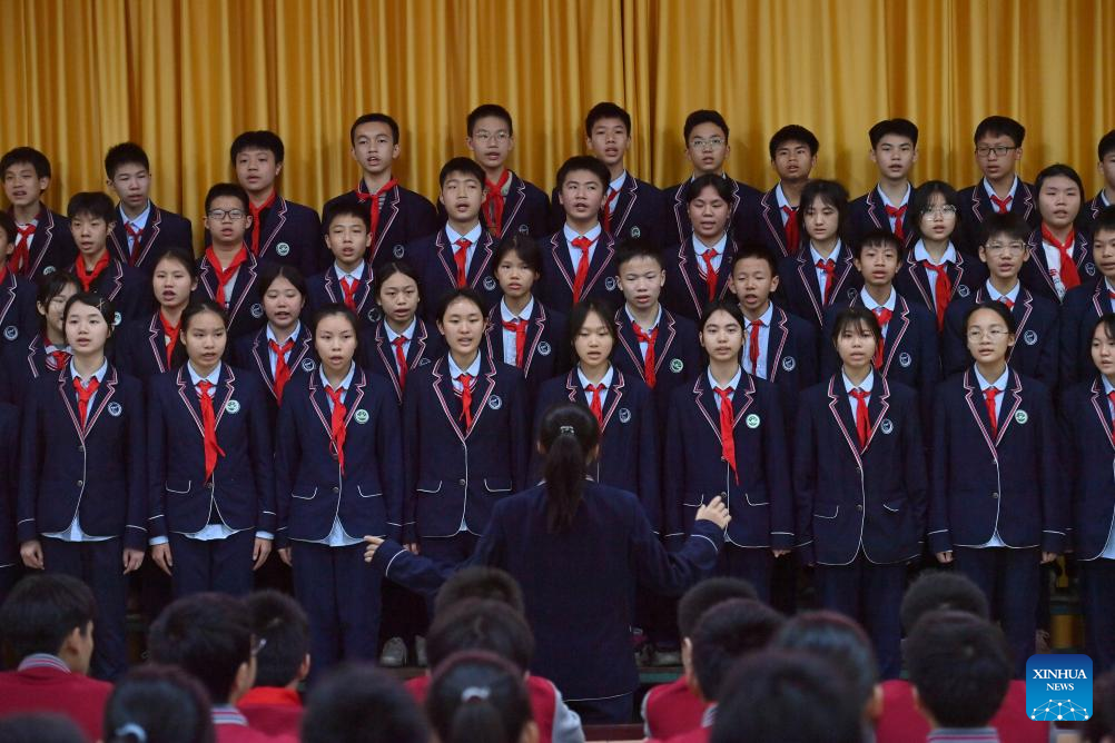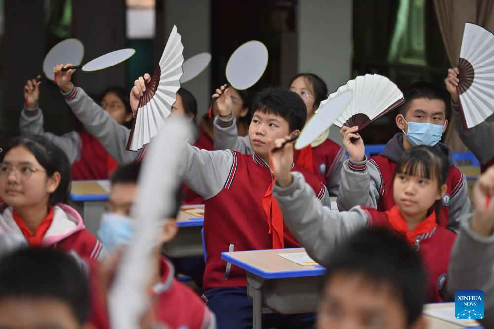 Students recite ancient poems during a break at a middle school in Wuzhou City, south China's Guangxi Zhuang Autonomous Region, March 30, 2023. In recent years, Wuzhou City has introduced lion dance, Cantonese opera and tea art into the campus to enrich students' extracurricular life. (Xinhua/Huang Xiaobang)