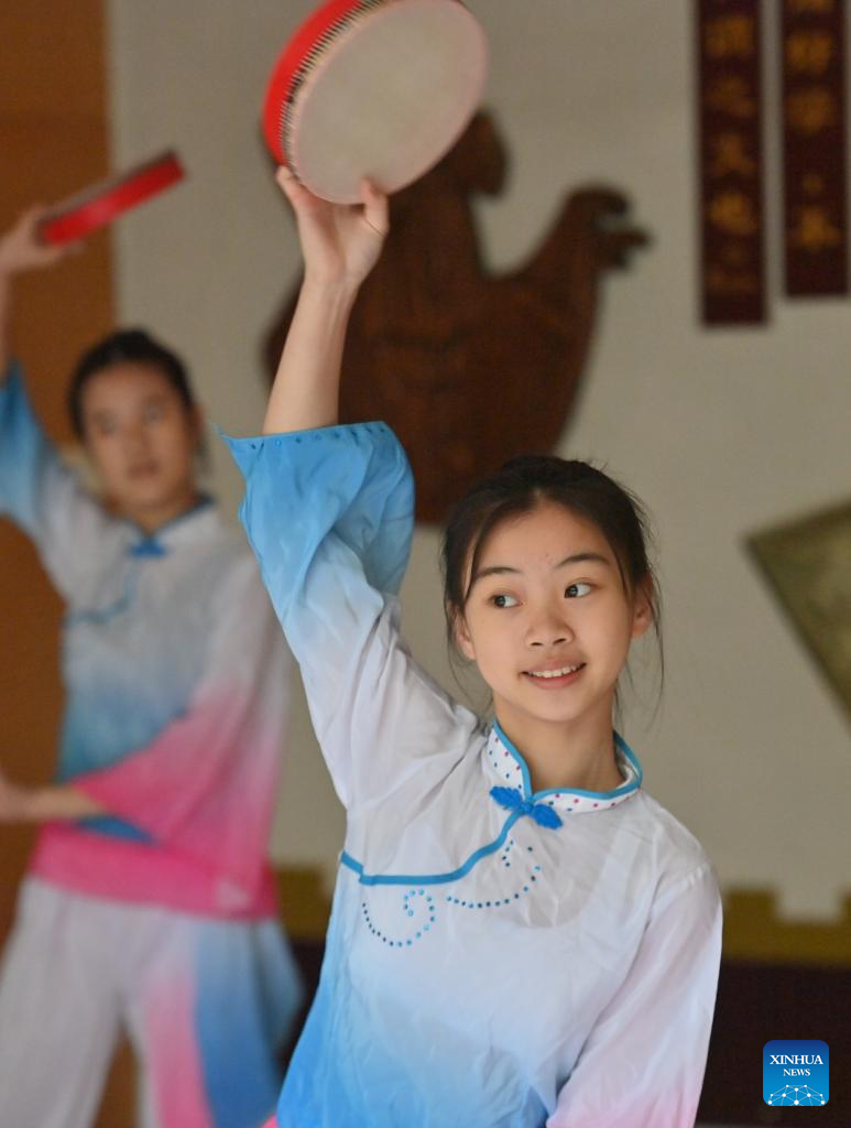 Students practice ethnic dance at a middle school in Wuzhou City, south China's Guangxi Zhuang Autonomous Region, March 30, 2023. In recent years, Wuzhou City has introduced lion dance, Cantonese opera and tea art into the campus to enrich students' extracurricular life. (Xinhua/Huang Xiaobang)