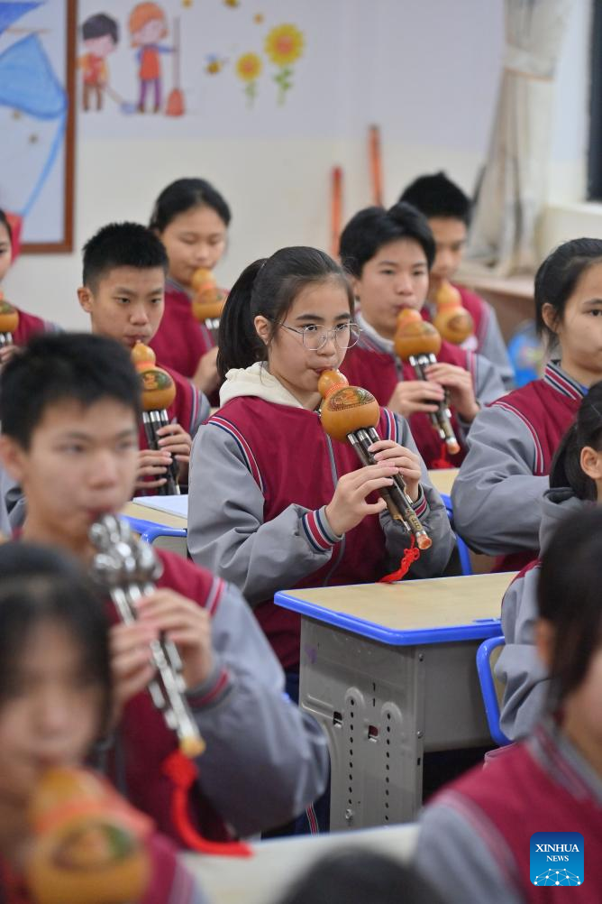 Students play the cucurbit flute at a middle school in Cangwu County of Wuzhou City, south China's Guangxi Zhuang Autonomous Region, March 29, 2023. In recent years, Wuzhou City has introduced lion dance, Cantonese opera and tea art into the campus to enrich students' extracurricular life. (Xinhua/Huang Xiaobang)