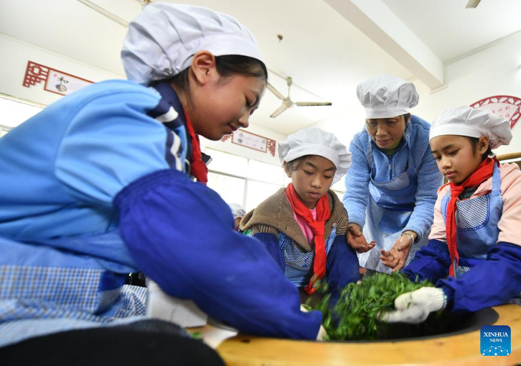Pupils learn to make tea at a primary school in Cangwu County of Wuzhou City, south China's Guangxi Zhuang Autonomous Region, March 29, 2023. In recent years, Wuzhou City has introduced lion dance, Cantonese opera and tea art into the campus to enrich students' extracurricular life. (Xinhua/Huang Xiaobang)