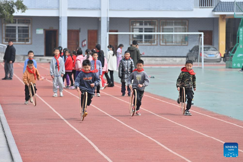 Students roll bamboo rings during a PE class at Xiayi Ethnic School in Mengshan County of Wuzhou City, south China's Guangxi Zhuang Autonomous Region, Feb. 22, 2023. In recent years, Wuzhou City has introduced lion dance, Cantonese opera and tea art into the campus to enrich students' extracurricular life. (Xinhua/Huang Xiaobang)