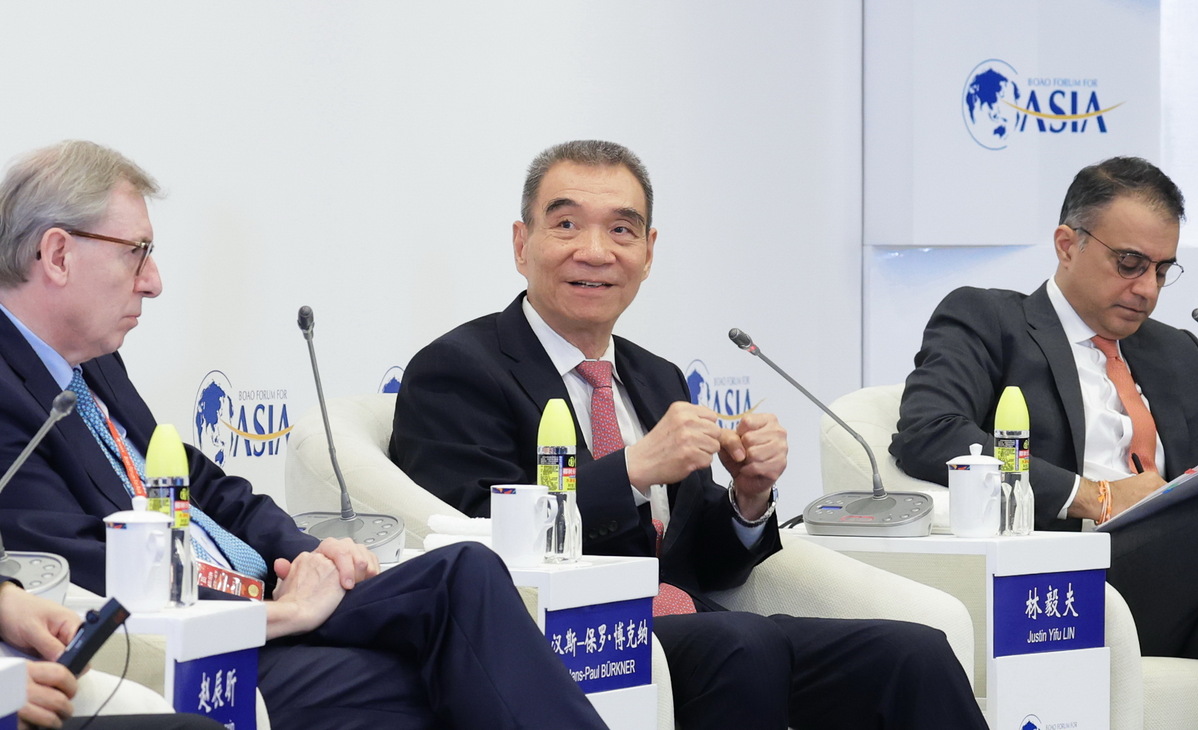 Justin Yifu Lin, center, speaks at the Boao Forum for Asia. [FENG YONGBIN/CHINA DAILY]