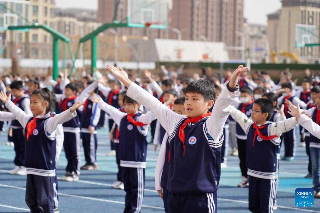 Children do exercises at the sportsground of Yunxi primary school in Xiong'an New Area, north China's Hebei Province, March 23, 2023. Located about 100 km southwest of Beijing, the Xiong'an New Area has been designed as a major recipient of functions previously located in Beijing but which are not essential to its role as China's capital. (Xinhua/Mu Yu)