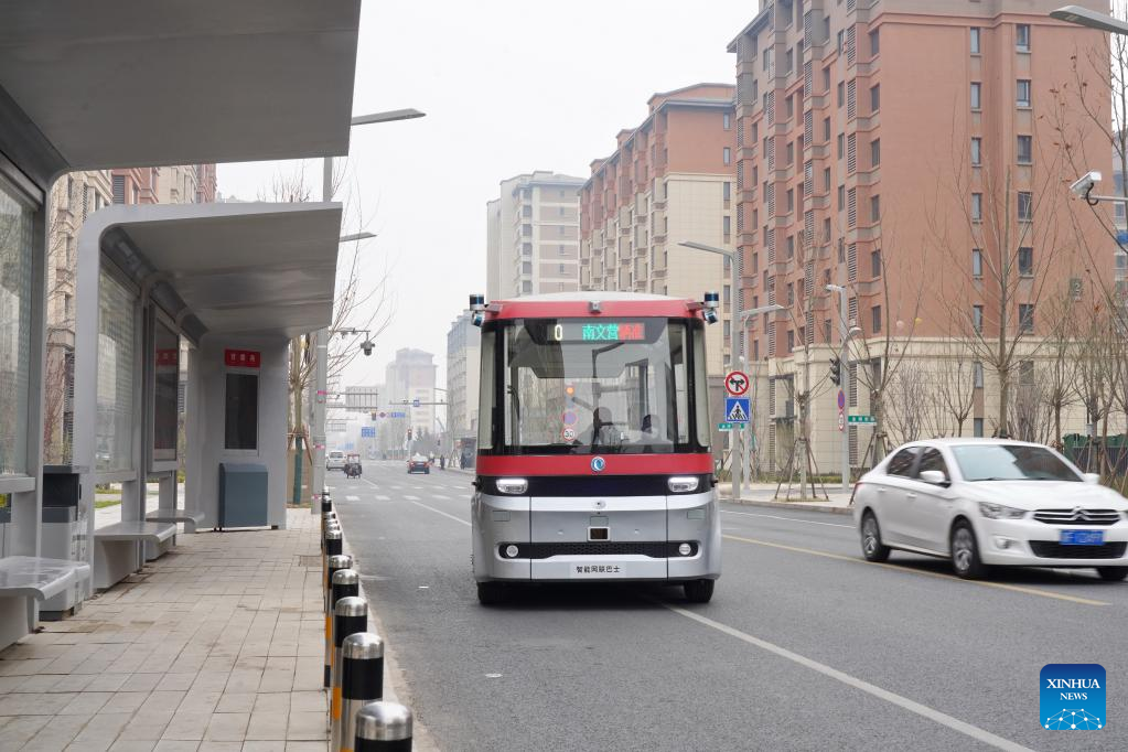 An intelligent connected bus runs on a road in Rongdong area of Xiong'an New Area, north China's Hebei Province, March 20, 2023. Located about 100 km southwest of Beijing, the Xiong'an New Area has been designed as a major recipient of functions previously located in Beijing but which are not essential to its role as China's capital. (Xinhua/Mu Yu)