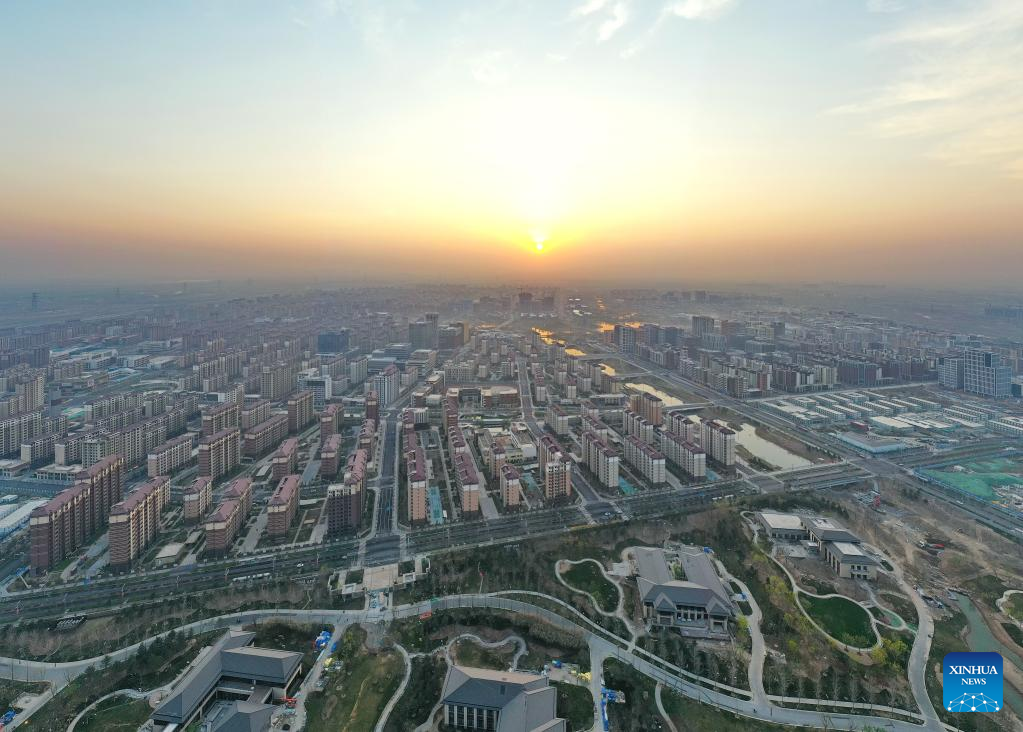 This aerial photo taken on March 31, 2023 shows the sunrise in Xiong'an New Area, north China's Hebei Province. Located about 100 km southwest of Beijing, the Xiong'an New Area has been designed as a major recipient of functions previously located in Beijing but which are not essential to its role as China's capital. (Xinhua/Mu Yu)