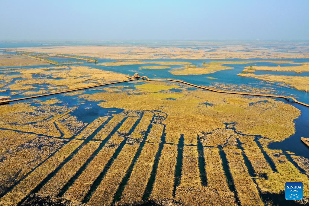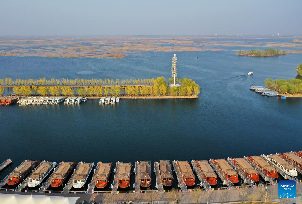 This aerial photo taken on March 30, 2023 shows the Baiyangdian scenic spot in Xiong'an New Area, north China's Hebei Province. Located about 100 km southwest of Beijing, the Xiong'an New Area has been designed as a major recipient of functions previously located in Beijing but which are not essential to its role as China's capital. (Xinhua/Mu Yu)