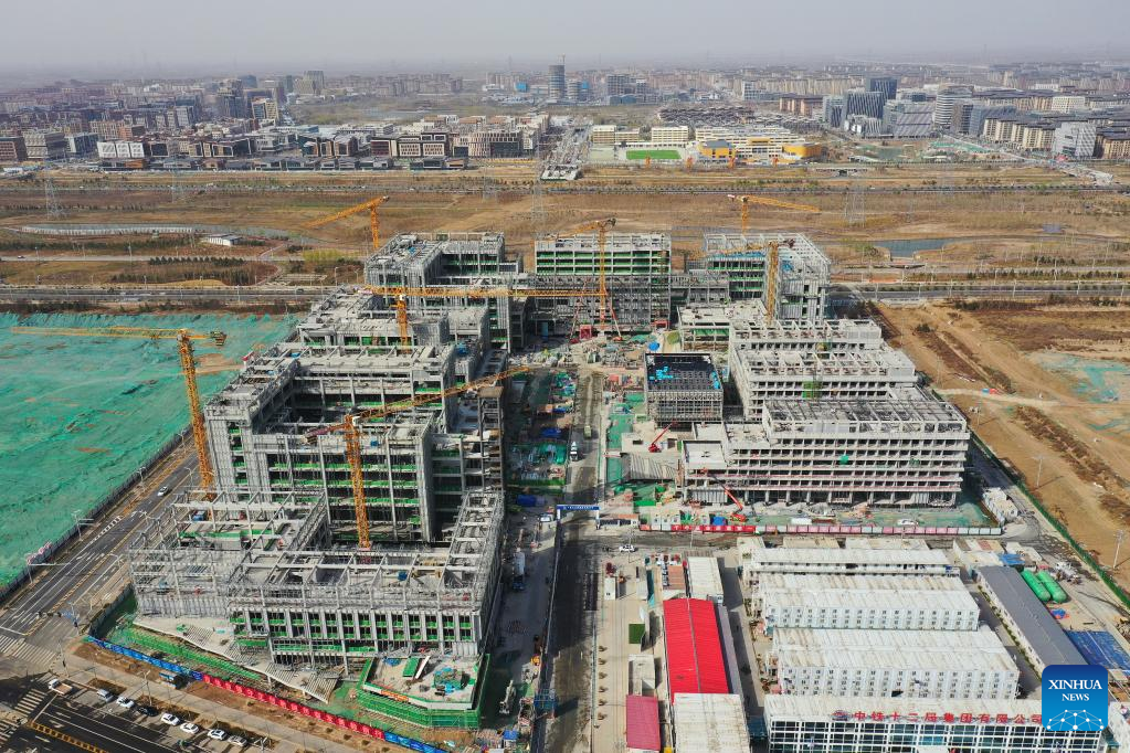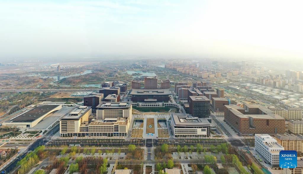 This aerial photo taken on March 31, 2023 shows the business service center in Xiong'an New Area, north China's Hebei Province. Located about 100 km southwest of Beijing, the Xiong'an New Area has been designed as a major recipient of functions previously located in Beijing but which are not essential to its role as China's capital. (Xinhua/Mu Yu)