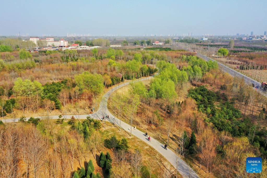 This aerial photo taken on March 30, 2023 shows a forest in Xiong'an New Area, north China's Hebei Province. Located about 100 km southwest of Beijing, the Xiong'an New Area has been designed as a major recipient of functions previously located in Beijing but which are not essential to its role as China's capital. (Xinhua/Mu Yu)