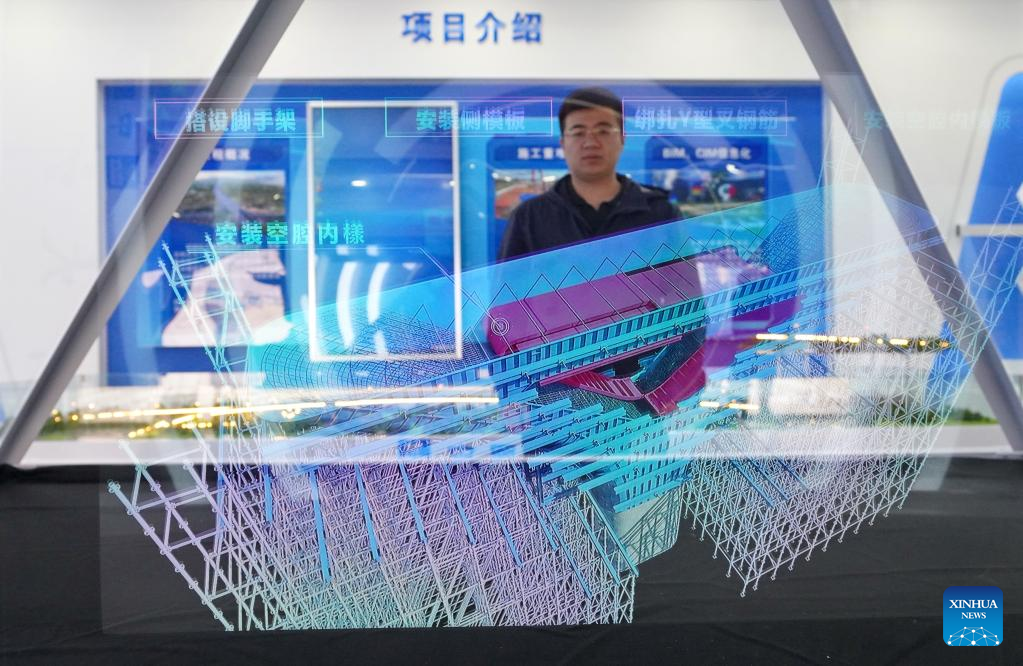 A staff member uses holographic projection to display a project in Xiong'an New Area, north China's Hebei Province, March 20, 2023. Located about 100 km southwest of Beijing, the Xiong'an New Area has been designed as a major recipient of functions previously located in Beijing but which are not essential to its role as China's capital. (Xinhua/Mu Yu)