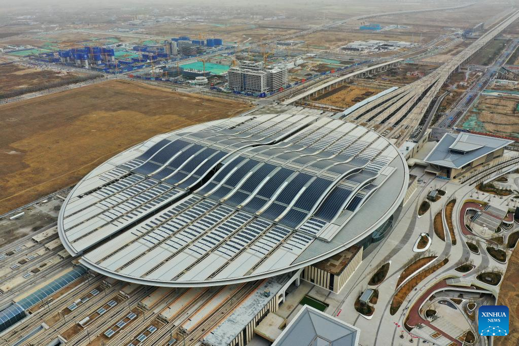 This aerial photo taken on March 23, 2023 shows the Xiong'an Railway Station in Xiong'an New Area, north China's Hebei Province. Located about 100 km southwest of Beijing, the Xiong'an New Area has been designed as a major recipient of functions previously located in Beijing but which are not essential to its role as China's capital. (Xinhua/Mu Yu)