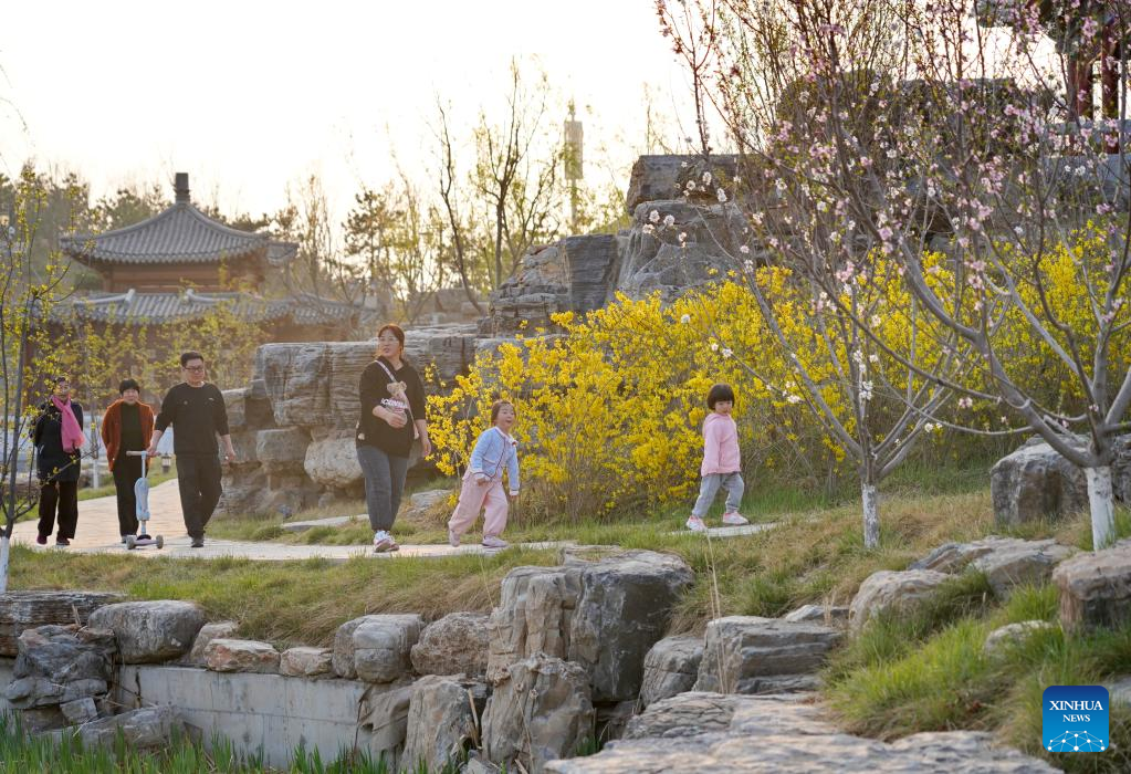 People visit a park in Xiong'an New Area, north China's Hebei Province, March 30, 2023. Located about 100 km southwest of Beijing, the Xiong'an New Area has been designed as a major recipient of functions previously located in Beijing but which are not essential to its role as China's capital. (Xinhua/Mu Yu)