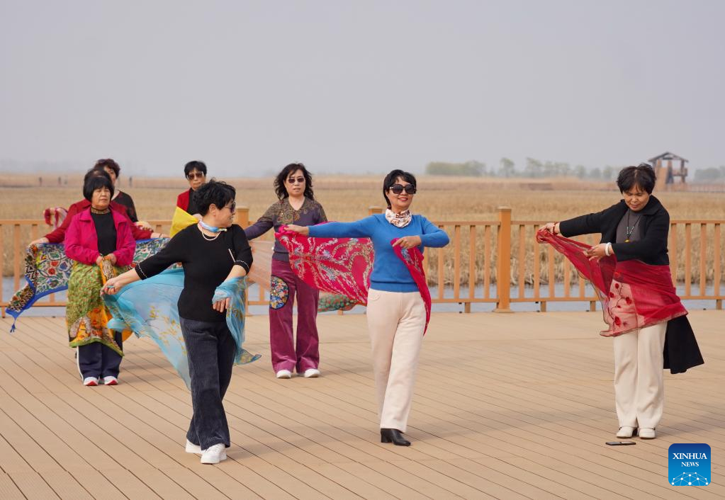 People rehearse a dance at the Baiyangdian scenic spot in Xiong'an New Area, north China's Hebei Province, March 21, 2023. Located about 100 km southwest of Beijing, the Xiong'an New Area has been designed as a major recipient of functions previously located in Beijing but which are not essential to its role as China's capital. (Xinhua/Mu Yu)