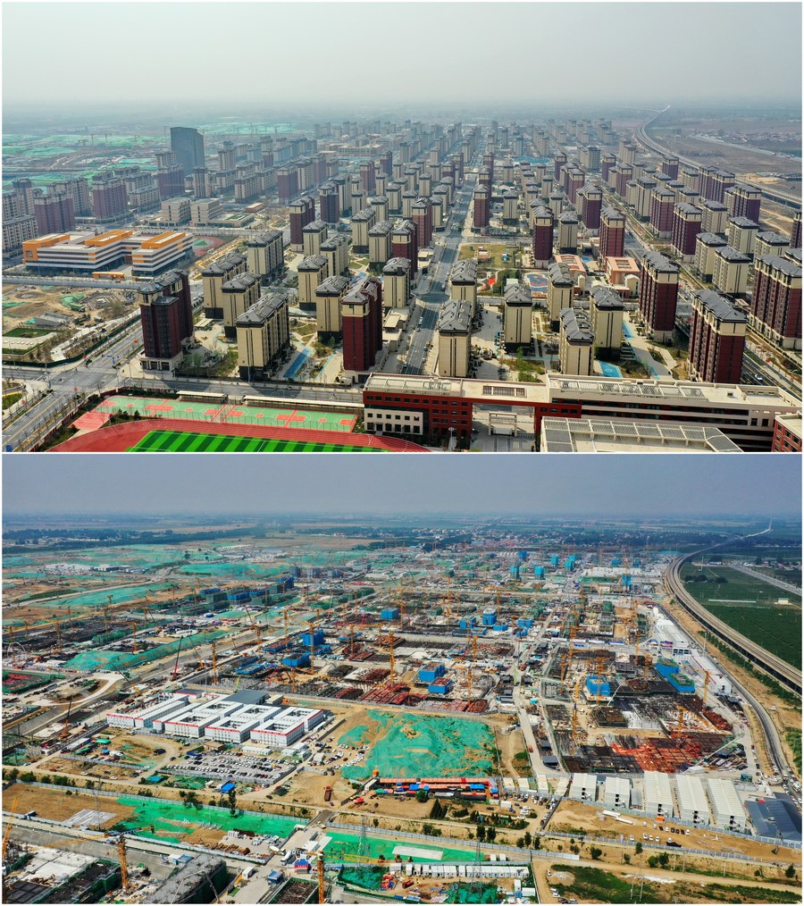 This combo photo shows the aerial view of the Rongxi area on March 31, 2023 (up) and the construction site of it on July 3, 2021 in Xiong'an New Area, north China's Hebei Province. (Xinhua/Mu Yu)