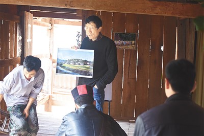 Li Xiaoyun, a professor at China Agricultural University, showcases a design plan for Hebian village, Mengla county, Xishuangbanna Dai Autonomous Prefecture, southwest China’s Yunnan Province to villagers. (People’s Daily Overseas Edition/file photo)