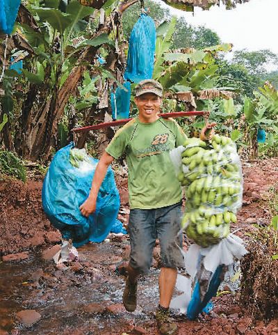 A villager carrying two bundles of bananas on a shoulder pole in Hebian village, Mengla county, Xishuangbanna Dai Autonomous Prefecture, southwest China’s Yunnan Province. (People’s Daily Overseas Edition/file photo)