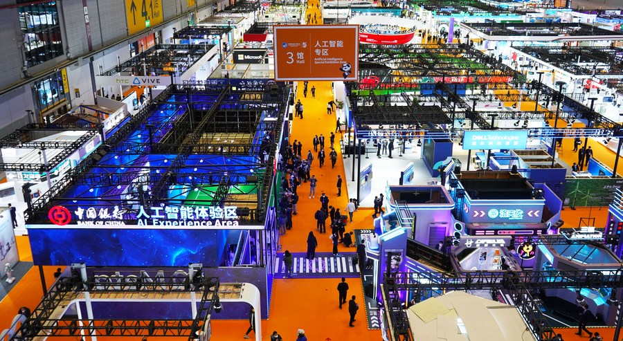 This photo shows the Artificial Intelligence Special Exhibition Zone of the fifth China International Import Expo (CIIE) at the National Exhibition and Convention Center (Shanghai) in east China's Shanghai, Nov. 5, 2022. (Xinhua/Jin Haoyuan)