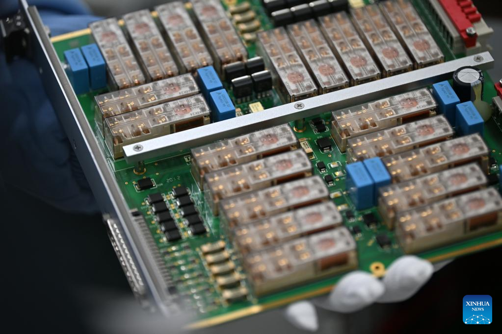 This photo taken on April 3, 2023 shows circuit boards produced by Traffic Control Technology Equipment Co., Ltd. in Wuqing District, north China's Tianjin. The Traffic Control Technology Equipment Co., Ltd. in north China's Tianjin is seeing a continuous increase in order volume this year. Inside the factory, dozens of machines are running at full capacity, and rows of circuit boards for the train operation control system are waiting to be delivered after rolling off automatic production lines.