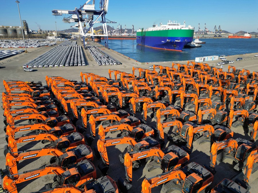 This aerial photo shows a cargo ship departing from the Yantai Port in Yantai, east China's Shandong Province, Jan. 9, 2023.(Photo by Tang Ke/Xinhua)