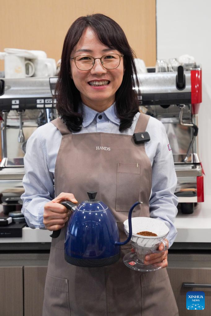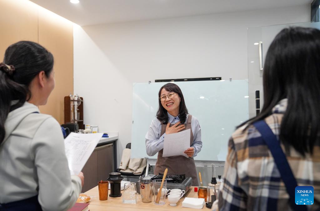 Huang Chunshan conducts training on coffee in Yanji, Yanbian Korean Autonomous Prefecture, northeast China's Jilin Province, April 4, 2023. The northeastern border city of Yanji in Yanbian Korean Autonomous Prefecture has witnessed a spark of coffee trend as over 540 coffee shops are registered in the 680,000 dwellers city in recent years. According to the data from Meituan Waimai, a major food delivery platform in China, Yanji ranked first in coffee consumption among counties (including county-level cities) in China from January to February this year. (Xinhua/Yan Linyun)