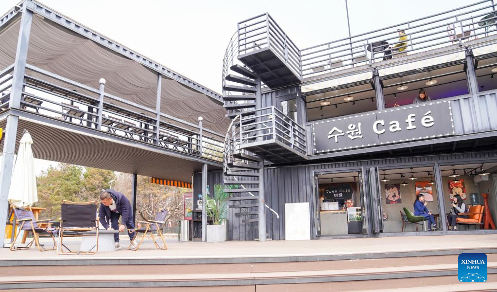 Shen Longzhe cleans up a his cafe in Yanji, Yanbian Korean Autonomous Prefecture, northeast China's Jilin Province, April 4, 2023. The northeastern border city of Yanji in Yanbian Korean Autonomous Prefecture has witnessed a spark of coffee trend as over 540 coffee shops are registered in the 680,000 dwellers city in recent years. According to the data from Meituan Waimai, a major food delivery platform in China, Yanji ranked first in coffee consumption among counties (including county-level cities) in China from January to February this year. (Xinhua/Yan Linyun)