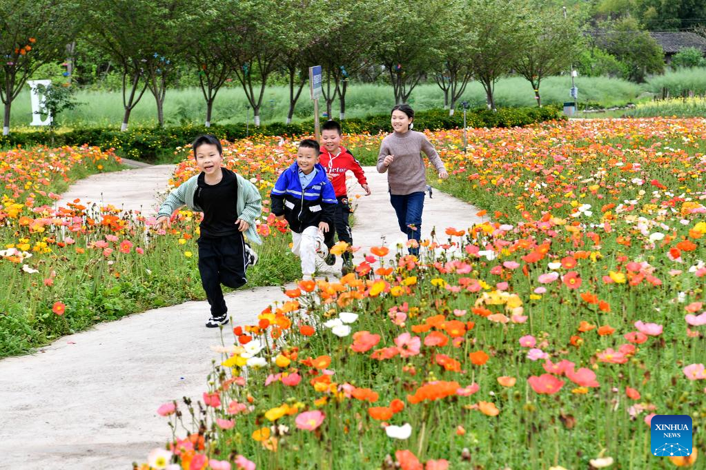 Children play among flowers in Yuechi County of Guang'an City, southwest China's Sichuan Province, April 5, 2023. People come outdoors for leisure and enjoy the beauty of spring during the Qingming festival, also known as Tomb-Sweeping Day, on Wednesday. (Photo by Zhang Qifu/Xinhua)