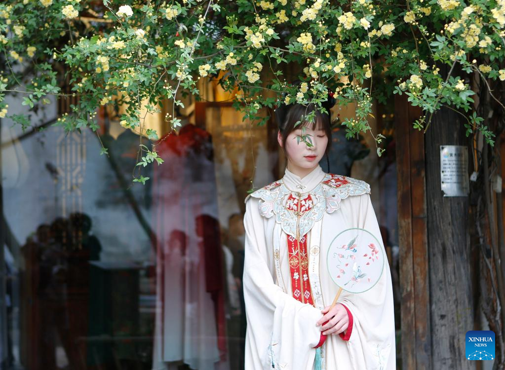 A tourist poses for photos in Pingjiang historic block in Suzhou, east China's Jiangsu Province, April 5, 2023. People come outdoors for leisure and enjoy the beauty of spring during the Qingming festival, also known as Tomb-Sweeping Day, on Wednesday. (Xinhua/Liu Wenhui)