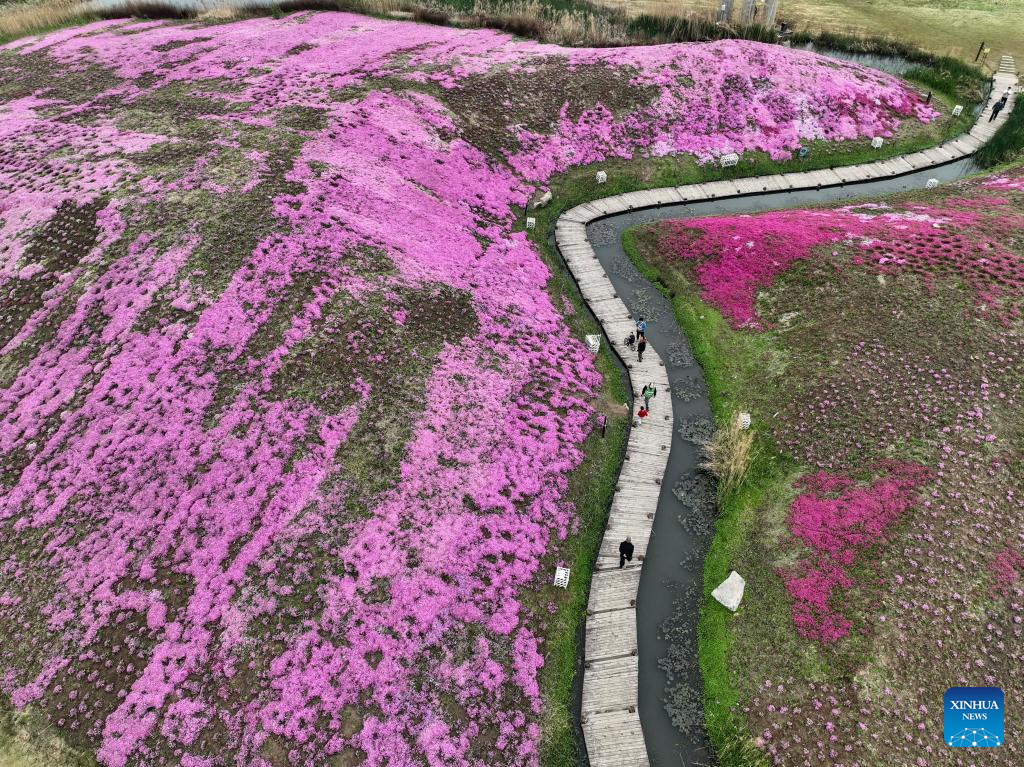 This aerial photo taken on April 5, 2023 shows tourists visiting flowers in a peony garden in Jiyuan City, central China's Henan Province. People come outdoors for leisure and enjoy the beauty of spring during the Qingming festival, also known as Tomb-Sweeping Day, on Wednesday. (Photo by Miao Qiunao/Xinhua)