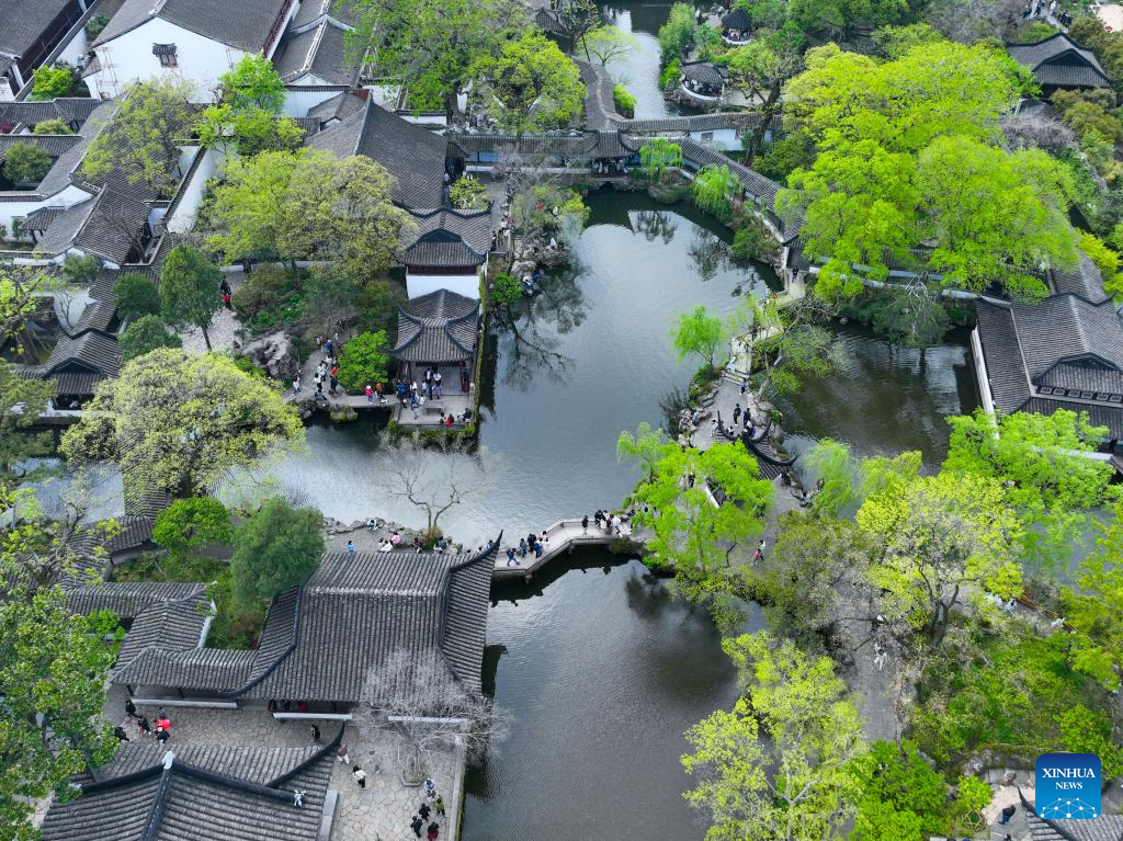 This aerial photo taken on April 5, 2023 shows people visiting Humble Administrator's Garden in Suzhou City, east China's Jiangsu Province. People come outdoors for leisure and enjoy the beauty of spring during the Qingming festival, also known as Tomb-Sweeping Day, on Wednesday. (Xinhua/Li Bo)