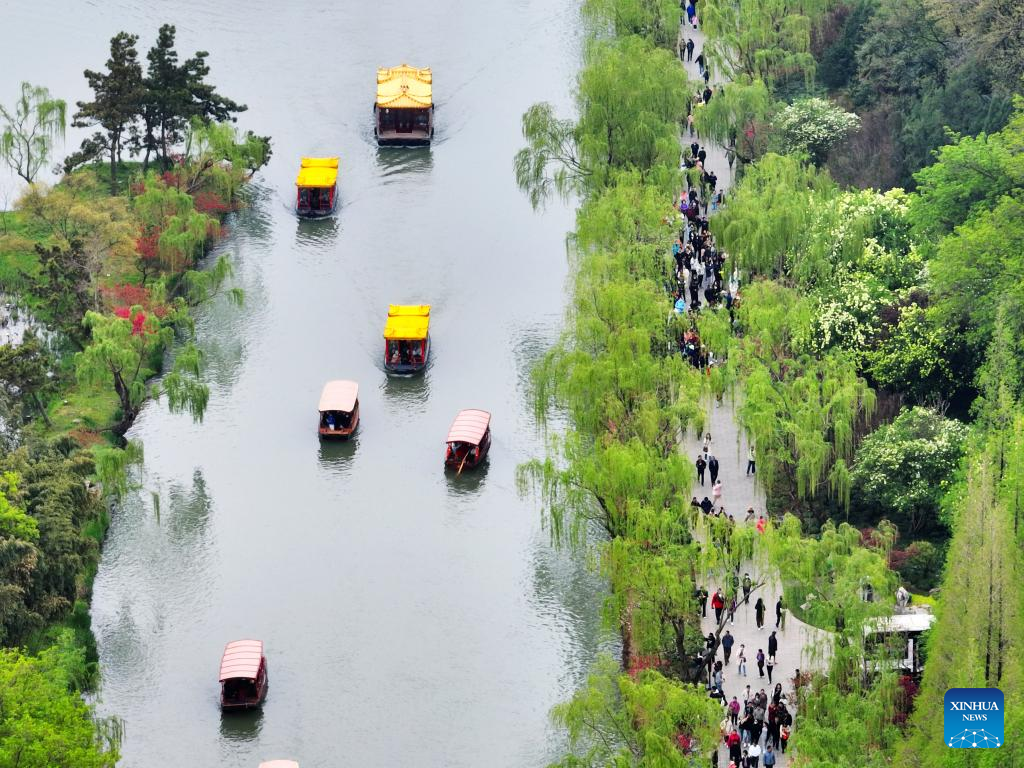 This aerial photo taken on April 5, 2023 shows tourists visiting Slender West Lake in Yangzhou, east China's Jiangsu Province. People come outdoors for leisure and enjoy the beauty of spring during the Qingming festival, also known as Tomb-Sweeping Day, on Wednesday. (Photo by Meng Delong/Xinhua)