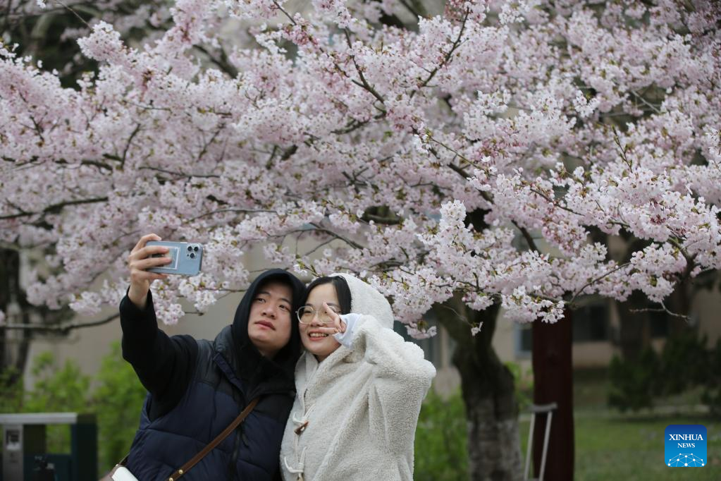 People take photos with blossoms in backdrop in Zhongshan park in Qingdao, east China's Shandong Province, April 5, 2023. People come outdoors for leisure and enjoy the beauty of spring during the Qingming festival, also known as Tomb-Sweeping Day, on Wednesday. (Photo by Huang Jiexian/Xinhua)