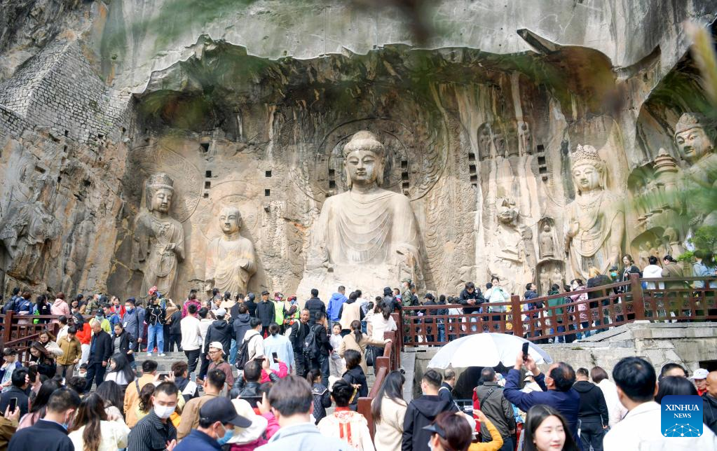 Tourists visit the Longmen Grottoes in Luoyang, central China's Henan Province, April 5, 2023. People come outdoors for leisure and enjoy the beauty of spring during the Qingming festival, also known as Tomb-Sweeping Day, on Wednesday. (Photo by Zhang Yixi/Xinhua)