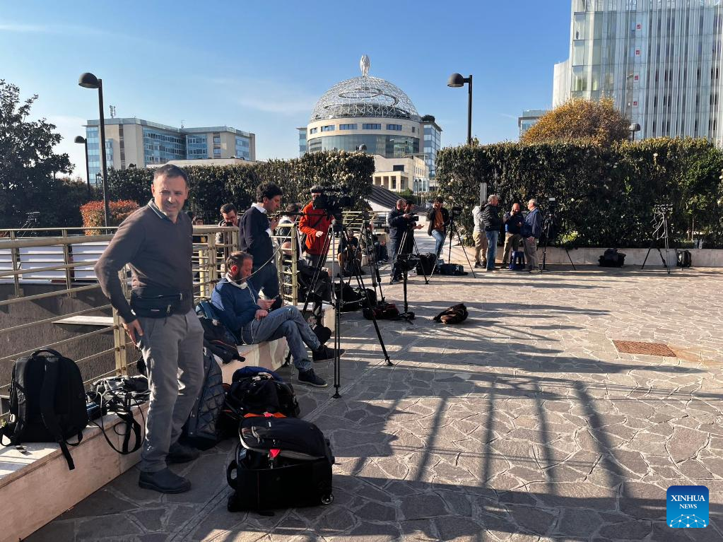 Journalists are seen outside San Raffaele Hospital where former Italian Prime Minister Silvio Berlusconi is hospitalized in Milan, Italy, on April 5, 2023. Berlusconi was admitted to the intensive care unit of a Milan hospital Wednesday, the Rome office of his political party Forza Italia has confirmed. (Xinhua/Zhou Xiaotian)