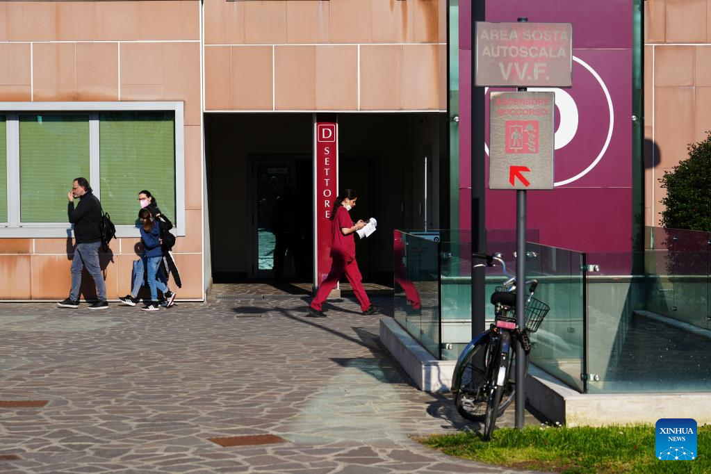 People walk past San Raffaele Hospital where former Italian Prime Minister Silvio Berlusconi is hospitalized in Milan, Italy, on April 5, 2023. Berlusconi was admitted to the intensive care unit of a Milan hospital Wednesday, the Rome office of his political party Forza Italia has confirmed. (Xinhua/Zhou Xiaotian)