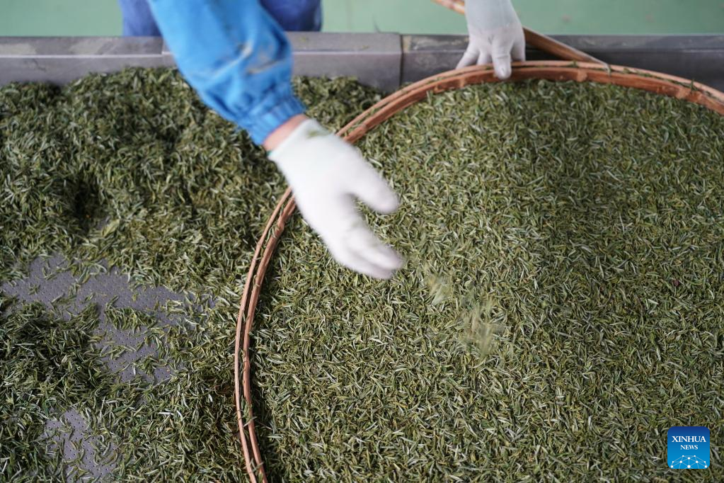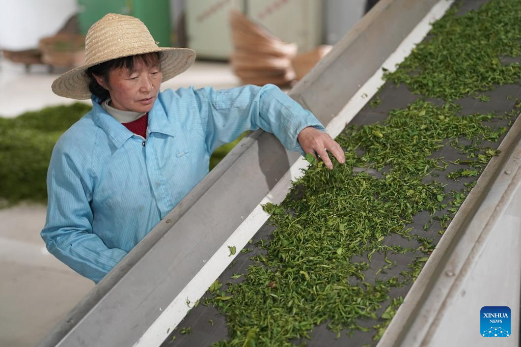 A villager works on the production line of tea leaves at the workshop of a tea company in Nanzheng District of Hanzhong, northwest China's Shaanxi Province, April 5, 2023. (Xinhua/Shao Rui)