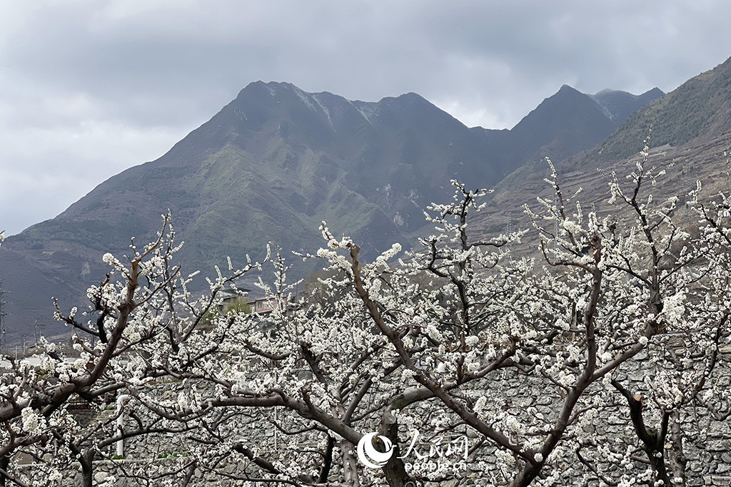 Photo shows blooming plum blossoms in Pingtou village, Fengyi township, Maoxian county, Aba Tibetan and Qiang Autonomous Prefecture, southwest China's Sichuan Province, March 27, 2023. (People's Daily Online/Zhou Jingyuan)