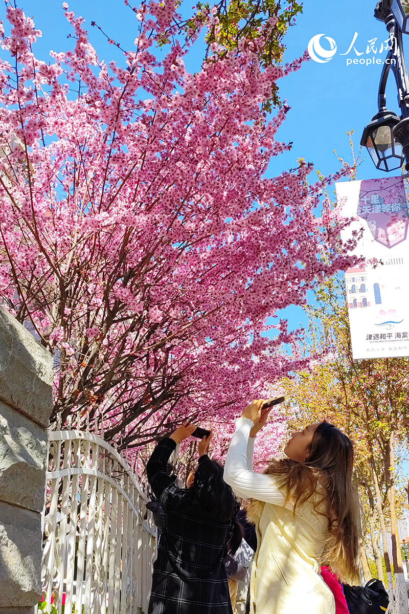Citizens take photos of blooming purple leaf plum trees at a famous street in north China's Tianjin Municipality, March 27, 2023. (People's Daily Online/Cui Xinyao)
