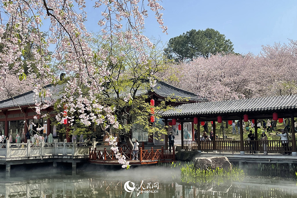Visitors enjoy the beautiful spring scenery of East Lake Cherry Blossom Park in Wuhan city, capital of central China's Hubei Province, March 26, 2023. (People's Daily Online/Zhang Juan)