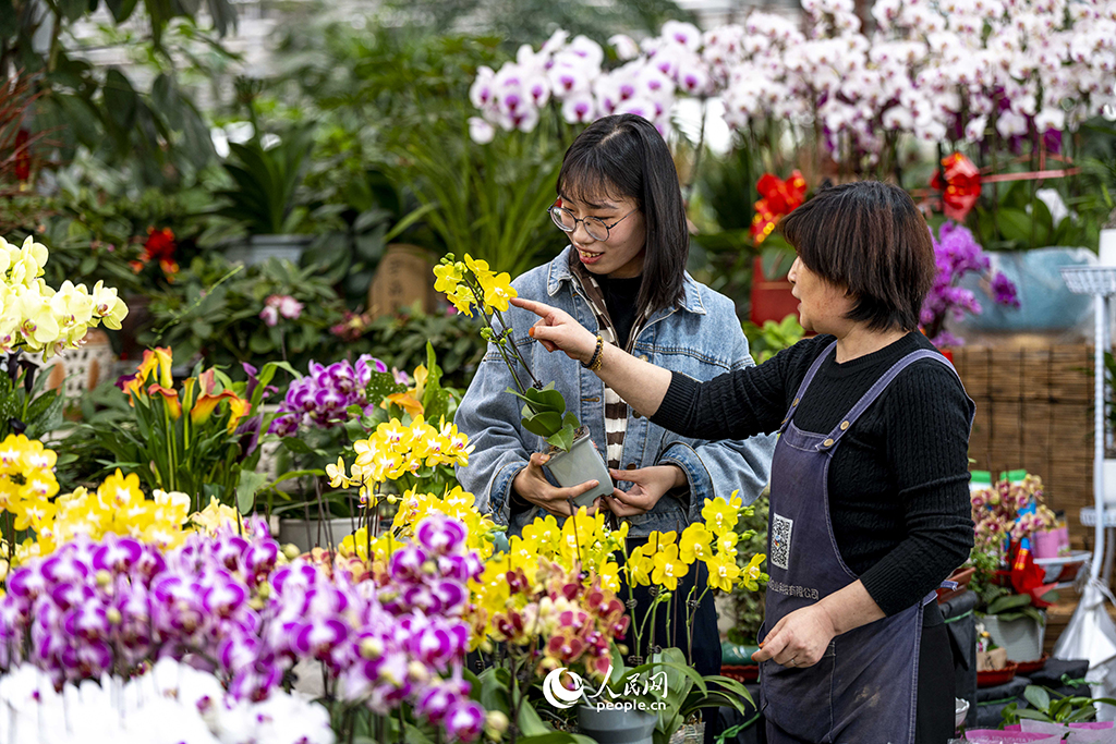 A citizen buys flowers at a flower market in Taiyuan city, capital of north China's Shanxi Province, March 23, 2023. (People's Daily Online/Lu Pengyu)