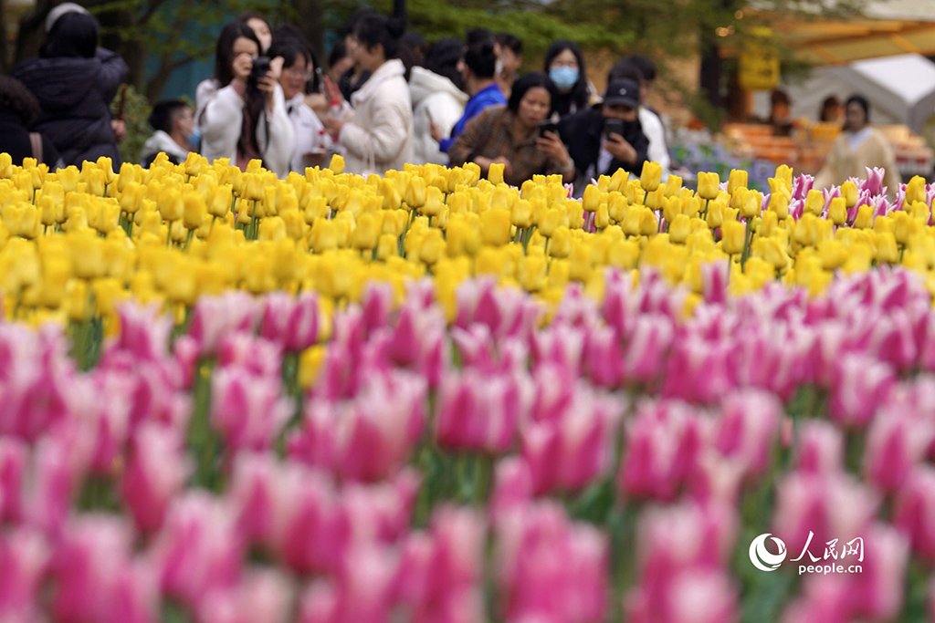 Visitors enjoy blooming tulips in Taiziwan Park in Hangzhou, capital of east China's Zhejiang Province, March 21, 2023. (People's Daily Online/Guo Yang)