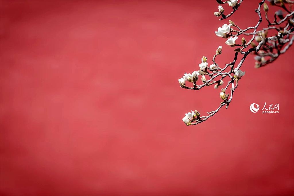 Photo taken on March 18, 2023 shows blooming magnolia flowers in front of a red wall in the Temple of Heaven in Beijing. (People's Daily Online/Zhang Qichuan)