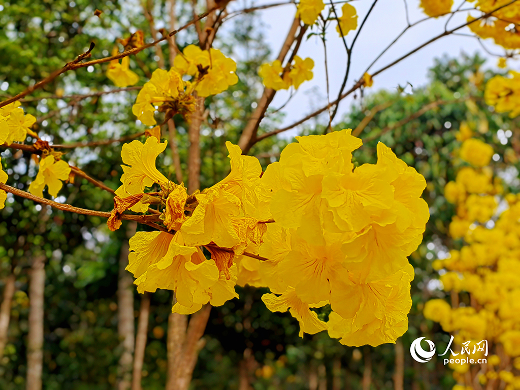 Photo shows flowering handroanthus chrysanthus planted by the forestry science research institute of Dehong Dai and Jingpo Autonomous Prefecture, southwest China's Yunnan Province, March 18, 2023. (People's Daily Online/Shan Fang)