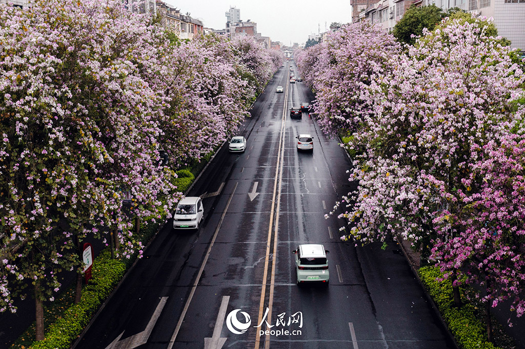 Photo taken on March 15, 2023 shows a view of blooming redbud flowers along a road in Yuzhou district, Yulin city, south China's Guangxi Zhuang Autonomous Region. (People's Daily Online/Yan Lizheng)