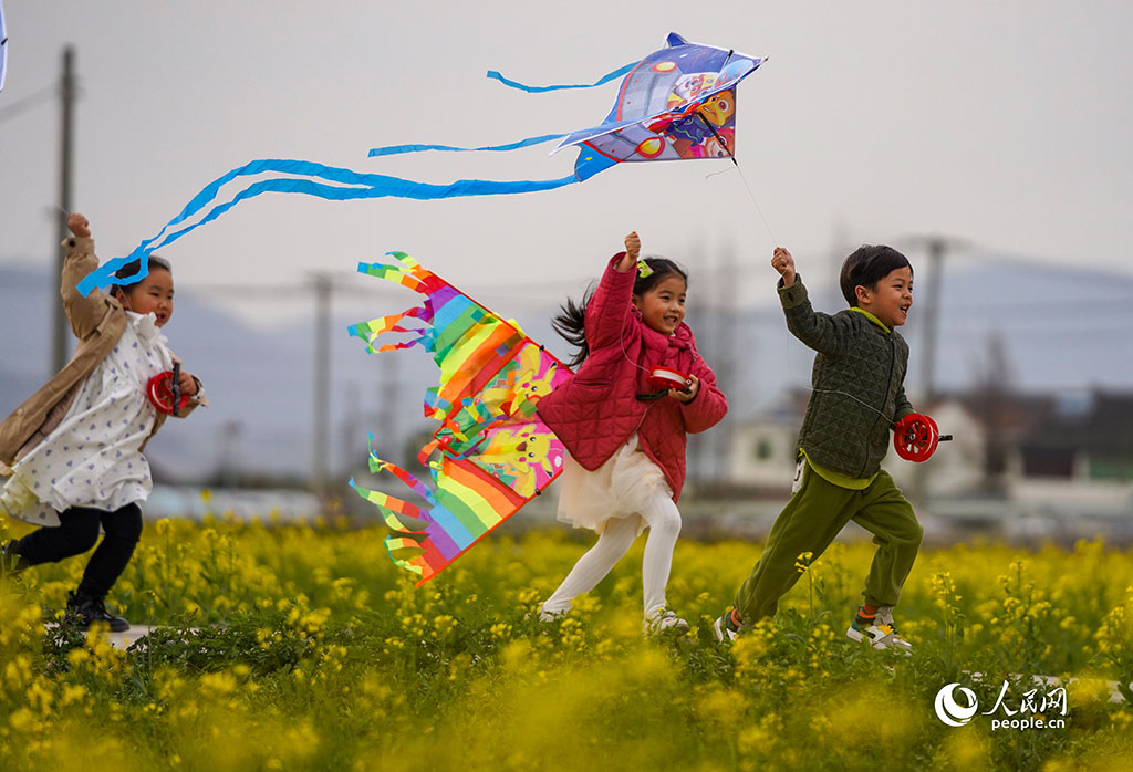 Children fly kites between rapeseed flower fields in Zhenhai district, Ningbo city, east China's Zhejiang Province, March 3, 2023. (People's Daily Online/Zhang Yongtao)