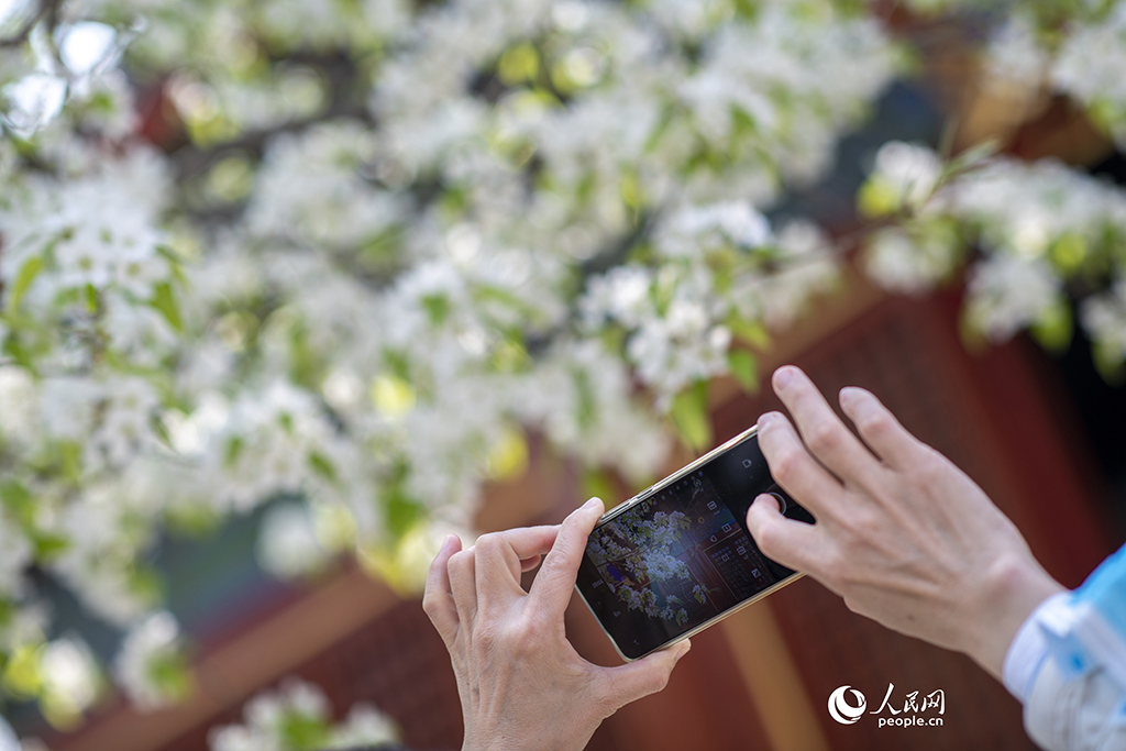 Photo shows a visitor taking photos of blooming pear blossoms in Zhihua Temple, an ancient temple in Beijing, March 29, 2023. (People's Daily Online/Yu Kai)