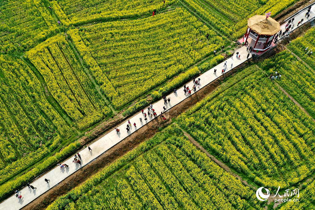 Golden rapeseed flowers covering an area of more than 9,800 mu attract visitors to Duimu village, Licun township, Fengcheng city, east China's Jiangxi Province, March 12, 2023. (People's Daily Online/Shi Yu)