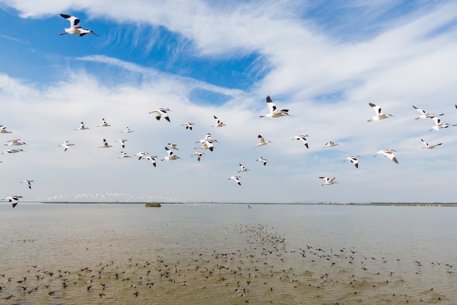 This photo taken on Oct. 20, 2022 shows birds flying over Chenhu Lake wetland in Wuhan, capital of central China's Hubei Province. (Xinhua/Wu Zhizun)