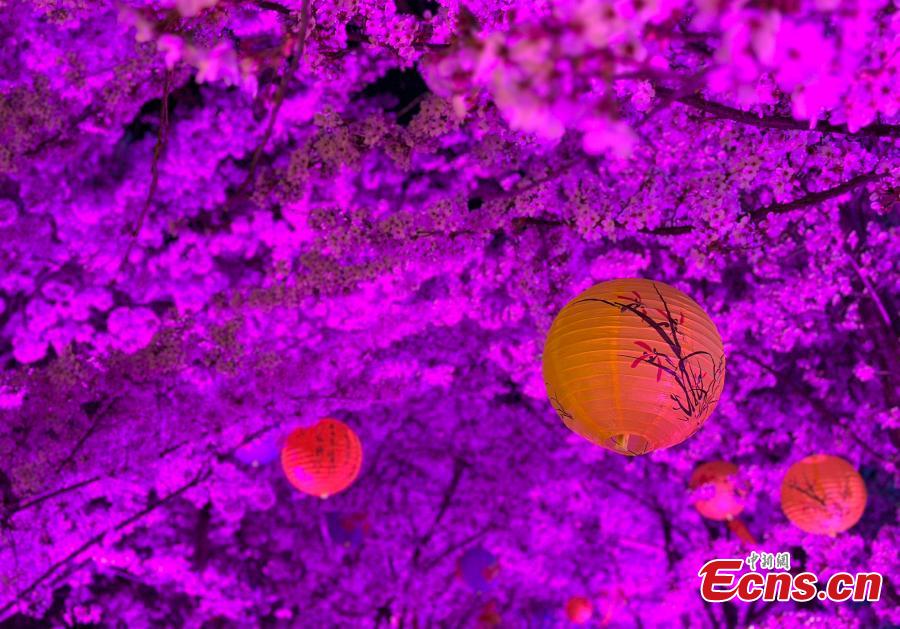 People are enchanted by cherry blossoms with colorful lights at night in Yantai, east China's Shandong Province, April 3, 2023. (Photo: China News Service/Qu Yuzhi)