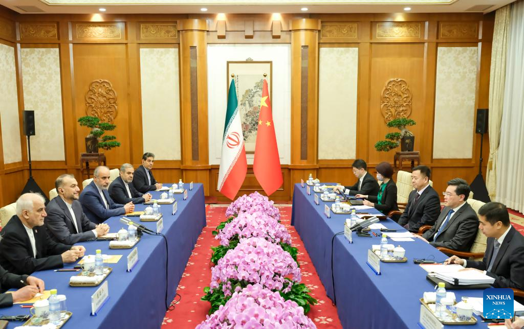 Chinese State Councilor and Foreign Minister Qin Gang meets with Iranian Foreign Minister Hossein Amir-Abdollahian in Beijing, capital of China, April 6, 2023. (Xinhua/Ding Lin)