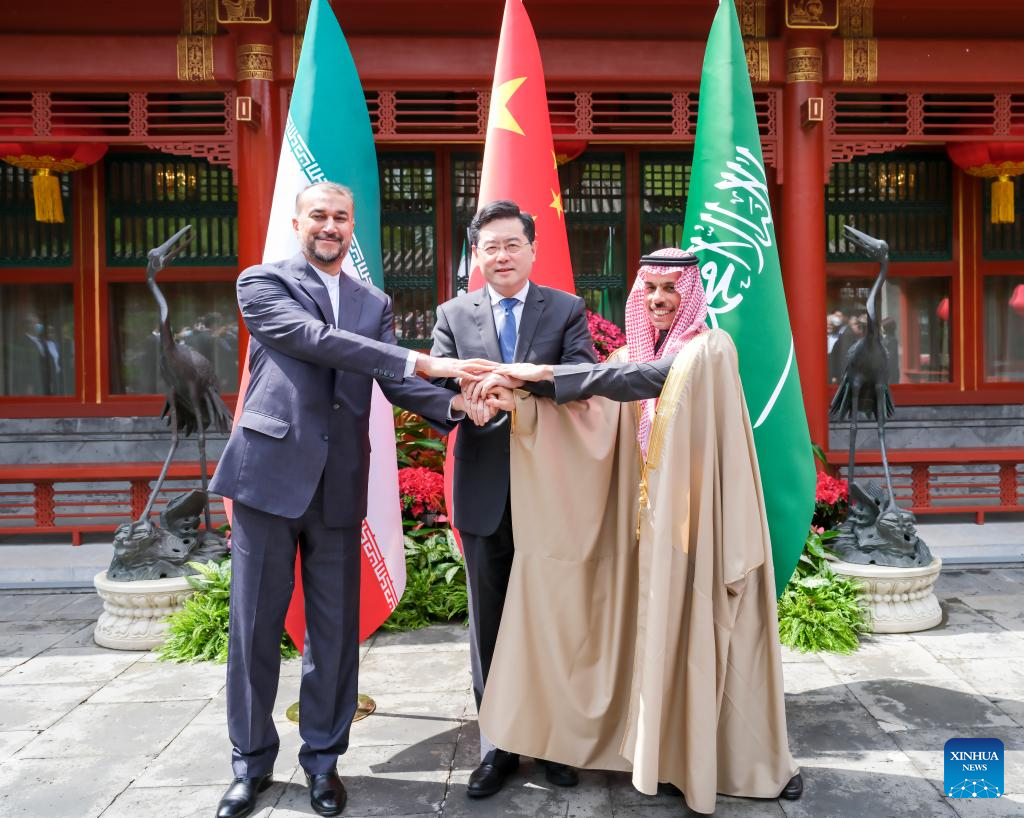 Chinese State Councilor and Foreign Minister Qin Gang meets with Saudi Arabian Foreign Minister Prince Faisal bin Farhan Al Saud and Iranian Foreign Minister Hossein Amir-Abdollahian in Beijing, capital of China, April 6, 2023. The two foreign ministers, Faisal and Amir-Abdollahian, are in Beijing for a meeting. After the meeting, Qin witnessed the signing of a joint statement between Saudi Arabia and Iran. The two countries announced the resumption of diplomatic relations with immediate effect. (Xinhua/Ding Lin)